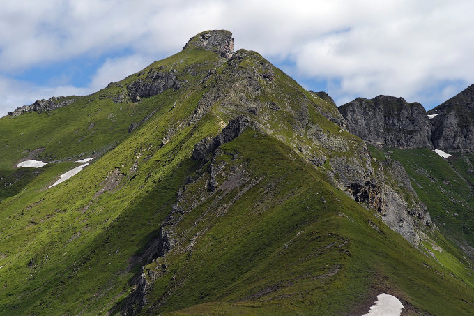 Der aus Gras und Schrofen gebaute Südgrat endet nach einem Kilometer am Foopass (2223 m).