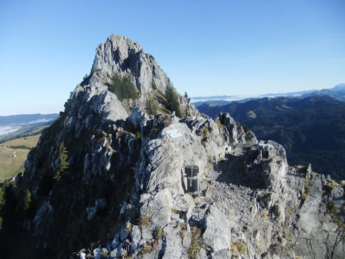 Eleganter Felszahn, der stark an ein Riff oder eine Klippe erinnert. Anders als sein grosser Bruder bietet der Klein Mythen keine wirklich leichten Aufstiege – die einfachste Route führt von Süden her auf den Gipfel und erfordert elementares Kraxelgeschick (SAC)