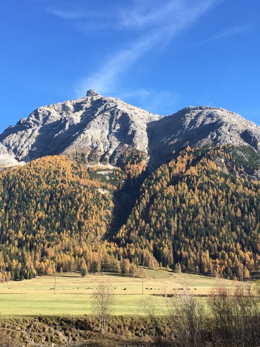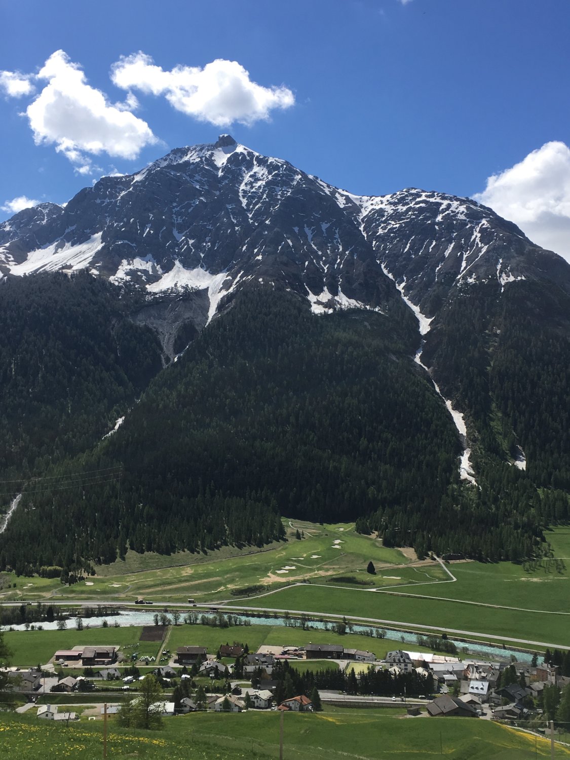 Imposanter Mezzaun (heisst etwa «mittlere Spitze»). Den markanten Verbindungsgrat zwischen Ostgipfel Punkt 3000 und Hauptgipfel 2963 m des Piz Mezzaun kennen alle, die bereits vom Unterengadin her in Richtung Samedan gefahren sind. Vom Tal aus wirkt der Berg mit seinen hellen Felsabstürzen recht wuchtig. Der Ostgipfel wird auch hie und da im Winter von Zuoz aus besucht.