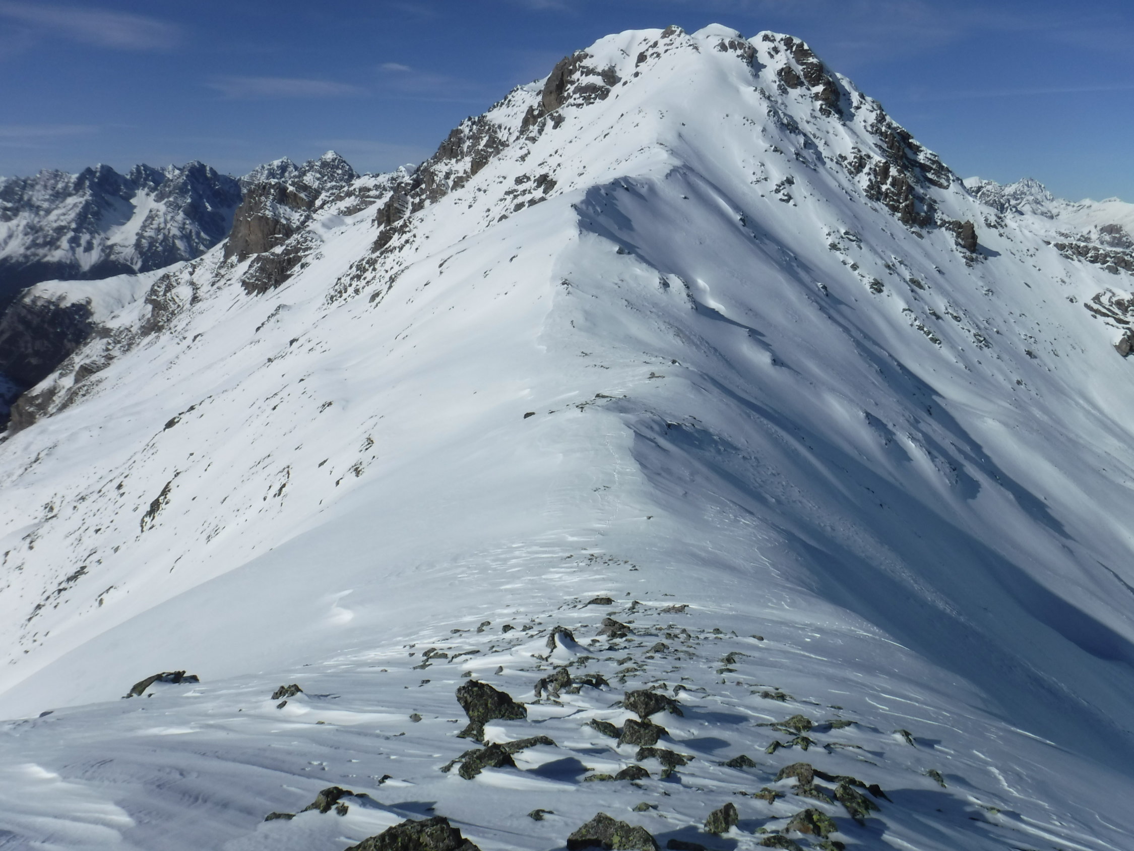 Südöstlicher Grenzgipfel des Piz Cristanas im Val Sesvenna. Ein von Ost und West etwas ansteigender, leichter Grat verbindet ihn mit dem Hauptgipfel