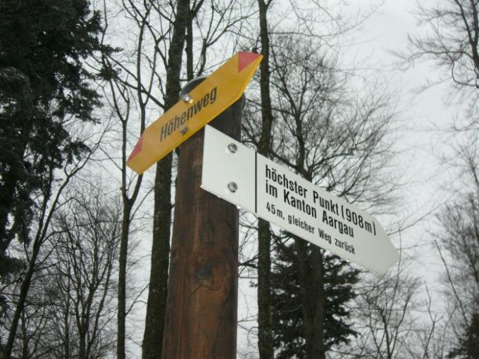 Der Geissfluegrat ist mit einer Höhe von 908m der höchste Punkt des Kantons Aargau. Die bewaldete Kuppe auf der Grenze AG/SO ist allerdings nur der nordöstliche Nebengipfel der Geissflue (962,9m), seine Schartenhöhe beträgt kümmerliche 5m!. Immerhin ist der Weg zum höchsten Aargauer gekennzeichnet und ein Gipfelstein zeichet ihn als solcher aus.