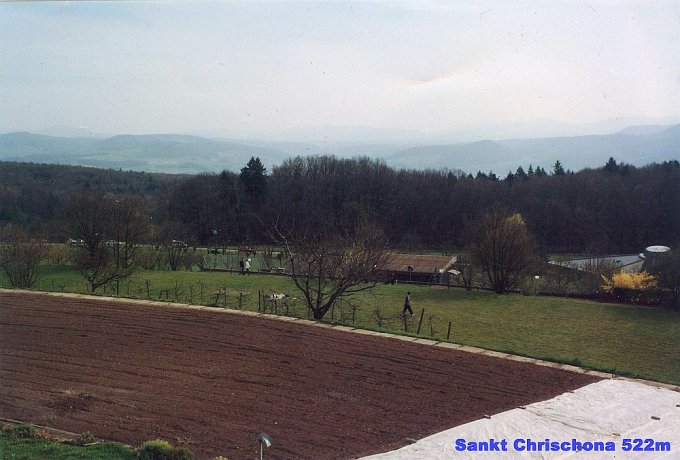 Die Sankt Chrischona wäre eigentlich keinen Eintrag auf dieser Seite wert, aber er ist der höchste Punkt vom Kanton Basel Stadt und wer Kantonshöhepunkte sammelt muss halt auch hier hinauf. Die Sankt Chrischona ist der Hausberg der Stadt Basel, er liegt in der Gemeinde Bettingen. Er ist auf zwei Seiten von der Grenze zu Deutschland umgeben. Der höchste Punkt befindet sich bei der Kirche und liegt auf 522m Von hier aus hat man bei klarem Wetter eine gute Aussicht auf die Oberrheinische Tiefebene mit der Agglomeration Basel, die Juraketten und die Alpen von der Jungfrau bis zum Säntis. Der Legende nach geht Sankt Chrischona auf drei Schwestern, Ottilie, Chrischona und Margarethe zurück, die jeweils in Sichtweite der anderen, auf einem Berg Kirchen bauten. Von Stankt Chrischona sind daher die Kirchen Sankt Ottilien im deutschen Ort Lörrach-Tüllingen und in Stankt Margarethen zu sehen. Ein weitherum sichtbares Merkzeichen in der Nähe ist der 250m hohe Fernsehturm Sankt Chrischona.