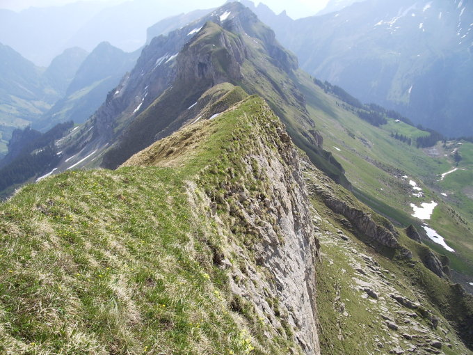 Erhebungen. Nach Norden und Süden jedoch steile Gras und Felsflanken. Mehrere bequeme Zugänge möglich.