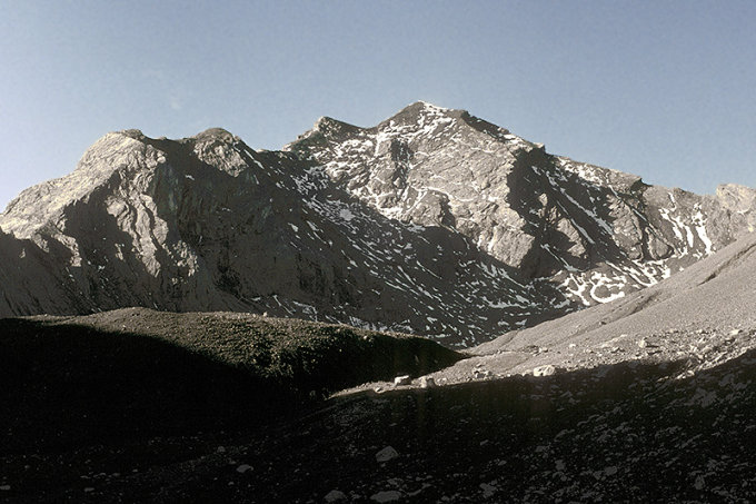 Brüchige Erhebung mit zwei Gipfelpunkten. Der nördliche Hauptgipfel misst 3164.8 Meter, der Südgipfel 3154 Meter.