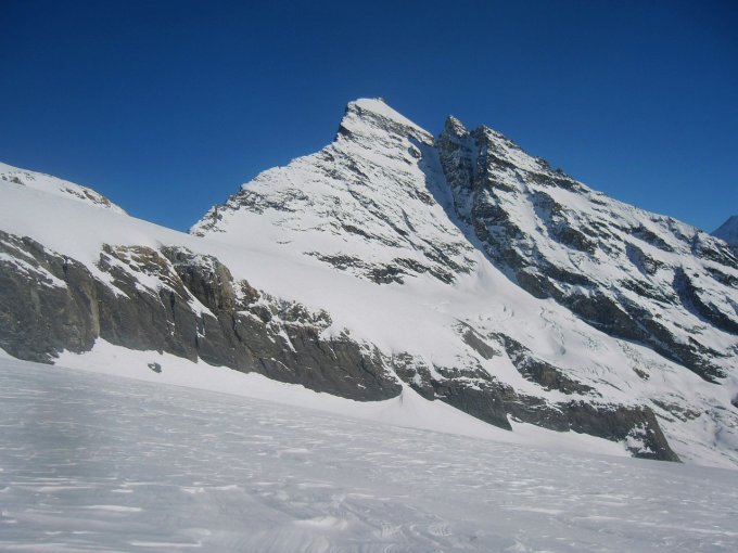 Von hier aus folgen wir in einfachem Gelände ansteigend der Gesteinsrippe bis auf 2650. Weiter hinauf über das Firnfeld und anschliessend zurück auf die Gesteinsrippebis bis ca. 2880. Von hier links haltend über den Wasserlauf auf die teils Schutt bedeckten Felsen, über welche wir auf 3100 den Schmadrifirn erreichen. Über den zu beginn steilen apern Gletscher hoch und anschliessend über den Firn, den grossen Schrund rechts umgehend, gemächlich ansteigend ins Schmadrijoch.