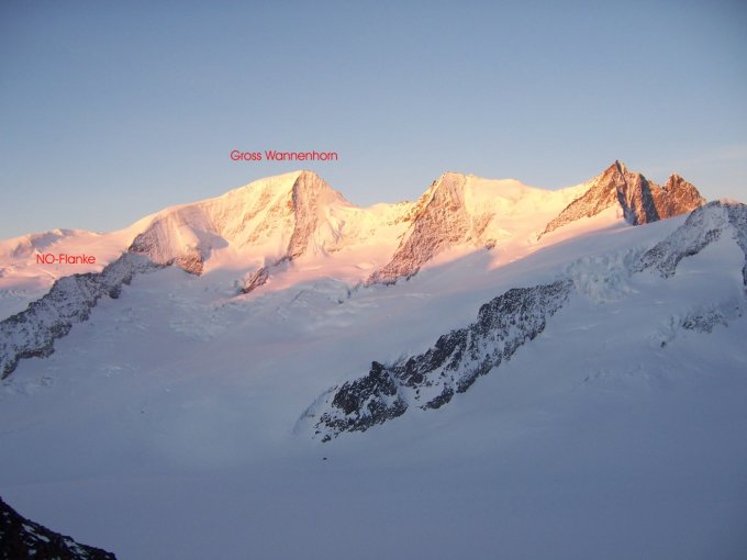 Das Gross Wannenhorn ist einer der schönsten und beliebtesten Skitourengipfel im Finsteraargebiet. Grandiose Rundumsicht auf die Berner- und Walliseralpen und Tiefblicke auf Aletsch- und Fieschergletscher. Gehört zur Kette der Walliser Fiescherhörner. Wird praktisch nur im Winter (März bis Juni) und über die vergletscherte und stark verschrundete NO-Flanke bestiegen. Eine Besteigung ist aber auch von der Aletschseite her über das Klein Wannenhorn (Wannenhornsattel) möglich. Ebenfalls gibt es eine wunderbare Abfahrtsvariante vom Gipfel über den Triftgletscher zum Fieschergletscher zu Pt. 2566m