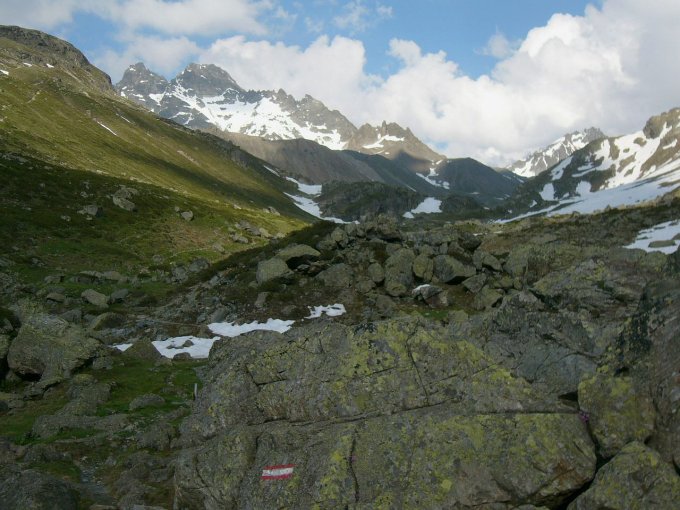Mentenalpe – Scheibenalpe – Brücke – Jamtalhütte – P 2277 – Breites Wasser – P 2446 – Finanzerstein – P 2763 – alter Steig 213 – Felsstein mit Steinmann – Weilenmann-Rinne – Trennungsrippe – SW-Scharte – Vorgipfel Südwand – Fluchthorn - retour29.07.2021