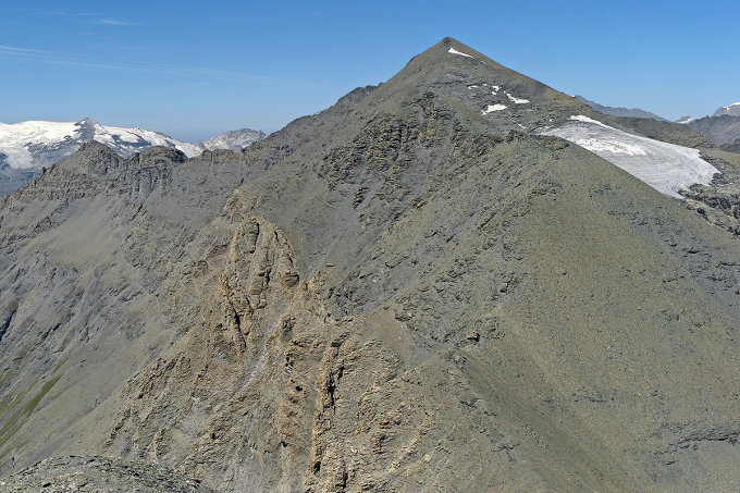 Vom höchsten Punkt zieht der Südostgrat über die Schuttkuppen Pointe du Vieux (3464 m) und Pointe du Chapeau (3419 m) zum Sattel Pas du Chapeau (3283 m).