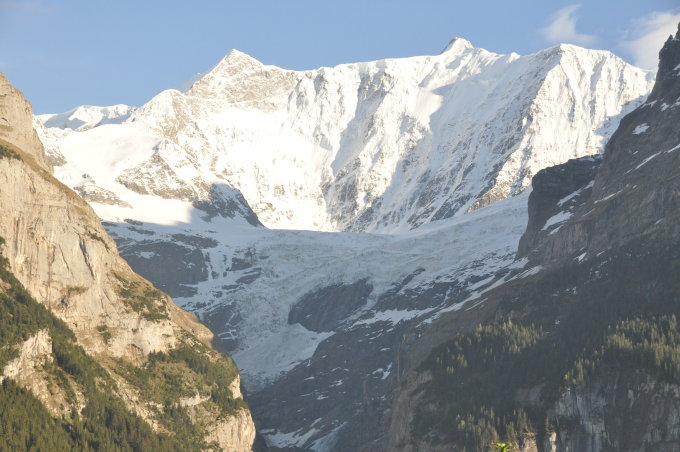 Das Gross Fiescherhorn liegt südlich zurückversetzt hinter Mönch und Eiger. Das Gross Fiescherhorn ist der höchste Gipfel der drei Fiescherhörner. Imposant fällt die Fiescherwand über 1000 Meter Richtung Norden ab.