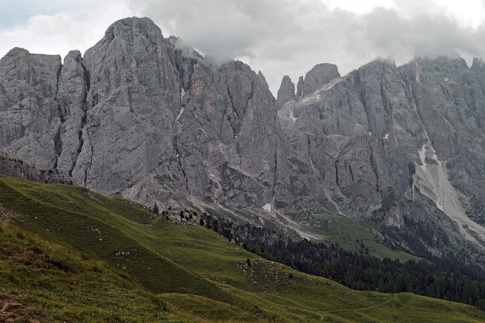 Von Südost bis Südwest dominiert der nahe Nordkamm der Palagruppe mit seinen Wandfluchten.