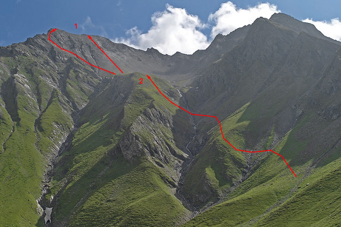 Die den Schuttkessel westseitig begrenzenden Gras- und Schrofenhänge zum Punkt 2496 im Westgrat ermöglichen alternativ einen etwas weniger mühsamen, aber mit Schrofenkraxelei verbundenen Aufstieg.