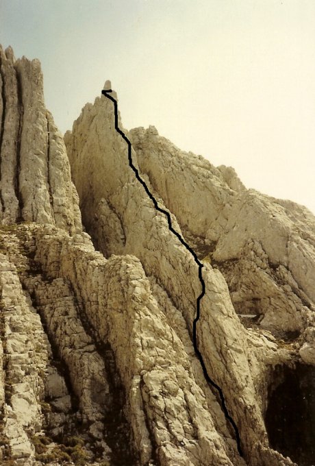 1. SL: Vom Stand hoch zum 1. Steilaufschwung (25m, III). 2. SL: Nicht den Aufschwung hoch, sondern links eine Rampe mit Riss und dann nach rechts durch einen Riss vor den 2. Kantenaufschwung zu schlechtem Stand (25m, III). 3. SL: Jetzt direkt die hier nur 1m breite Rippe an herrlichen Henkeln senkrecht hoch und oben wo der Grat waagrecht wird den Block umfassend extrem ausgesetzt nach rechts um den Block herum zu Stand dahinter (40m, IV und III). 4. SL: Den waagrechten Grat entlang (35m, III und I). 5. SL: Über eine Rampe und Geröll zum Gipfel (30m, II).