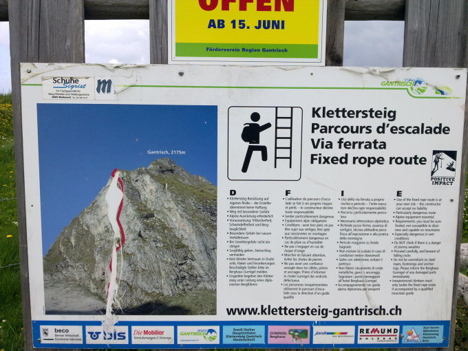 Über den 2007 gebauten Steig mit ca. 400 Eisenbügeln klettert man reine 220 Hm französisch abgesichert (mit durchgängigem Stahlsicherungsseil) an der Ostseite des Gantrisch bereits am frühen Morgen in der Sonne. Die einzelnen Abschnitte sind mit Schildern versehen. Ungewohnt: die durchhängenden Seile. Steile Wandhänge am Einstieg führen gleich in die Schwierigkeit KS4 ein. Auf 2 Alu-Sprossenleitern über erstes Grasband zur nächsten Felswand. Über das 70 m hohe "Küre-Wändli" gelangt man zu weiterem Grasband. Dort über Alu-Strick-Leitern hinweg zu 2 Alu-Sprossenleitern in nächste Felswand hoch. Von dort links auf Wandfluh-Traverse zum Kletterfinale an senkrechter, fast überhängender Horber-Kante (benannt nach dem KS-Initiator). Über oberes Felsende dann auf Strickleitern zum Wandbuch. Links davon durch eine Felsnische hinauf zum Ausstieg auf breitem Wiesenhang zu hölzernem Kreuz auf dem Vorgipfel. Von dort dann zum kreuzlosen Gipfel des Gantrisch (Kletterzeit: 1,5 Std.).