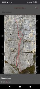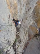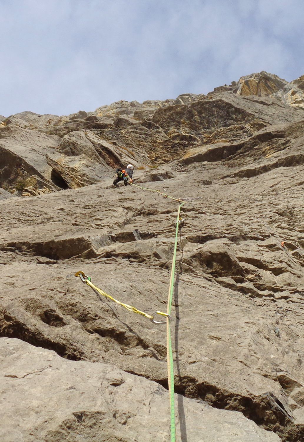 SL1-3 sind jeweils recht lang (gut 40 m). Man folgt immer den Bh (im Zweifel denen mit gelben Plättchen). In SL3 muß man recht ordentlich stehen. In SL4 ist der Start leicht brüchig. Als Alternative bietet sich die wunderschöne Direktvariante über die Überholspur an (jeweils selbe Standplätze, aber schwerer (6b+)). SL5 ist nur 26 m lang. Genau wie untern, eng gesichert. Durchweg ordentlicher Fels, z.T. geht man R der Verschneidung. SL6 (25 m, 6a) ist ein spezieller Leckerbissen. Der Kalk hat hier einen hohen Kristallinanteil, fühlt sich an wie Granit und ist richtig bunt. Entsprechend klettert man recht athletisch zwischen scharfen Kanten (besonders dicht gesichert) bis zum Wandbuch/Routenende (dort gibt es pro Jahr ca. 25 Einträge).