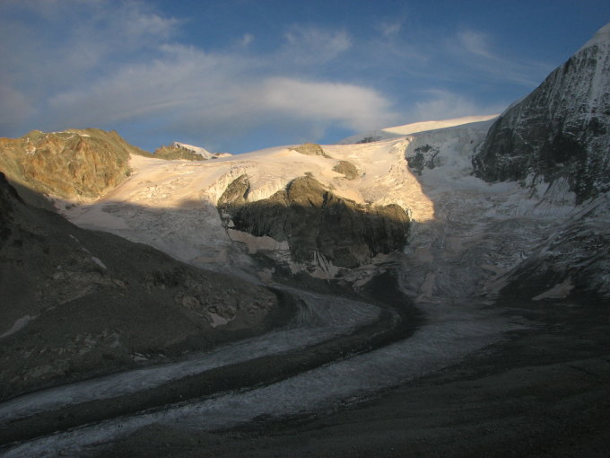 Der SAC Clubführer Walliser Alpen 2, Auflage 1999, empfiehlt die Überschreitung von West nach Ost. Ich halte das für einen Übertragungsfehler, denn zum einen spricht alles für die umgekehrte Richtung, zum zweiten schreibt der Führer unter R 932 (Ostgrat) selbst, dass sich dieser gut für den Aufstieg eigne. Also: Ost - West! Von der Cabane des Dix auf den Steigspuren Richtung Arolla hinab bis zum flachen Gletscher, danach in südöstlicher Richtung über Geröll und Eis bis etwa 2920 m. Am orographisch rechten Rand des Gletschers etwas steiler in jetzt nordöstlicher Richtung hinauf in die Mulde unterhalb der Pointes de Tsena Refen. Unter diesem Grat auf einer Art Rampe teilweise steiler hinauf in wieder südöstlicher Richtung (einige Spalten!), bis auf dem nun flacher werdenden Gletscher ab etwa 3350 m in südwestlicher Richtung zum Col de la Serpentine gequert werden kann. Der folgende steile Schneehang zum Schneegipfel wird inzwischen von einem felsigen Stück aus Platten, losen Blöcken und Geröll unterbrochen. Nicht schwierig, aber unangenehm und nicht steinschlagsicher für unterhalb steigende Seilschaften. Oberhalb dieser Felszone steilt sich der Schnee- bzw. Eishang vorübergehend auf, bei sehr schlechten Verhältnissen kann es besser sein, dem Felsband weiter nach links zu folgen und den Steilhang zu umgehen. Über den Schneegrat (Achtung auf große Wechten nach rechts!!) bis zum Beginn der Felsen. Nach einigen wenigen Metern in leichtem Gelände bricht der Grat in eine erste Scharte ab. Abklettern ist möglich, allerdings ist auch eine Abseilstelle von 10 - 15 m mit zwei Schlingen eingerichtet und vorzuziehen. Der nach dieser Scharte folgende Gendarm wird überklettert in sehr gutem Fels. Es handelt sich bei diesem ersten Turm noch nicht um die beiden Gratköpfe, die laut Führer umgangen werden sollen! Vom Turm über den Grat abklettern mit einigen ausgesetzten, plattigen Stellen, bis zu dem markanten, Richtung Dix überhängenden Doppeltürmchen. Kurz vom Grat absteigen, aber gleich wieder über ein Band zurück zum Grat hinter dem Doppeltürmchen. Wer den ersten Turm trotzdem umgehen will, steige nicht zu tief ab - nur wenige Meter - und quere nach links bis zu einer stumpfen Verschneidung. Unterhalb der Verschneidung sind in den Platten verschiedene Abseilstellen zu sehen: NICHT dorthin absteigen, sondern der Verschneidung aufwärts folgen, bis man unterhalb der beiden Gratköpfe wieder auf die richtige Route trifft und über ein gutes Band nach links in die Scharte hinter den beiden Gratköpfen queren kann. Danach immer dem Grat folgen, teilweise ausgesetzt, bis zum steilen Gipfelaufschwung, der sich durch eine Art Kamin in ausgezeichnetem Fels gut überwinden lässt. Beim Abstieg am Westgrat immer am Grat bleiben, auch bei dem kleinen Turm gleich zu Beginn, der sich gut absichern lässt und mit besten Griffen aufwartet. Nach dem Gletscherteil trifft man wieder auf Fels der einem zum Col de Cheilon leitet. An diesem Grat sollte man trotz vieler Spuren der Versuchung widerstehen, nach links in die Flanke abzusteigen, der Grat bietet guten Fels und muss nur gelegentlich für wenige Meter verlassen werden. Zeitbedarf bis Gipfel 4,5 Std, insgesamt 7 Std.