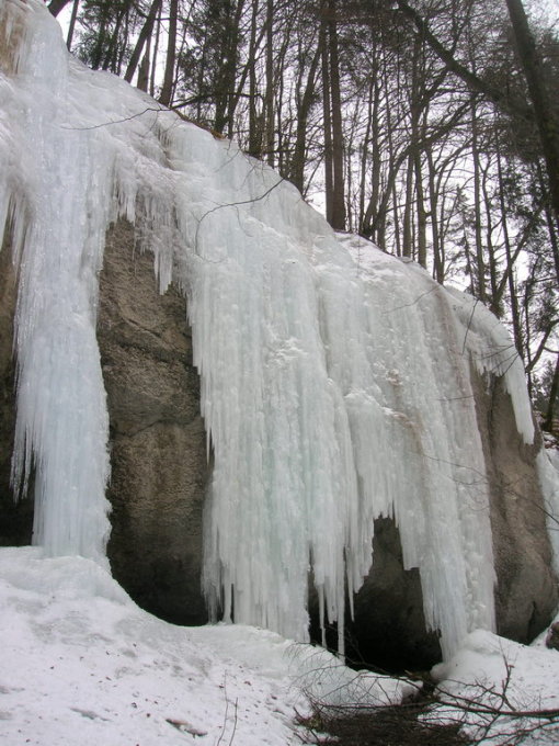8-15 Meter hohe Eissäulen, die sich hervorragend für Einsteiger eignen, da an den darüberstehenden Bäumen topropes eingehängt werden können (Zugang auf der rechten Seite der Säulen).
