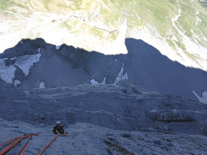 Sl2 6b+, 30m: Es beginnt so, wie man es entsprechend dem Eiger-Nimbus erwartet..., anspruchsvolle Kletterei in nicht überall zuverlässigem Fels. Die (dünn gesäte, aber grundsätzlich solid und korrekt gesetzte) Absicherung lässt uns vorerst mal ab und zu leer schlucken.
