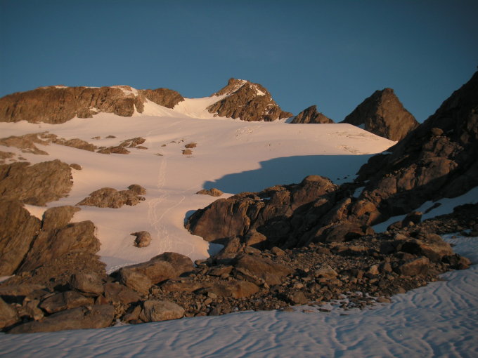 Von der Hütte ein kurzes Stück das Bachbett hoch, dann auf dem Pfad nach rechts (N), später nach W bis zu den Seen. An diesen links vorbei, Richtung W, den Steinmänchen folgend, eine Rinne hoch bis zur Rundbuckelzone südlich vom Chipfestock. Danach hoch zu Punkt 2724, entweder gemäss Route 558a (SAC Führer Hochtouren Berner Alpen) rechts um den Chipfestock oder, kürzer, links vom Chipfestock die Moräne hoch (teilweise Pfadspuren und Steinmänner). Ab ca. 2800m auf dem Gletscher weitersteigen. Den letzten steilen Firnhang entweder direkt W-wärts hoch oder, weniger steil, auf dem Firn-Ast nach SW hoch und via kl. Felsplateau (Frühstücksplatz) bis unterhalb des ersten Vorbaus (Gratturm). Über Platten und Geroll an den Vorbau. Gemäss Tour 558 klettert man links herum und steigt durch ein steiles Couloir auf den E Grat. Oder man umsteigt den Gratturm rechtsseitig auf einem schmalen Bändchen und klettert über eine plattige Verschneidung und Schutt auf den E Grat. Nun über den Grat mit Schutt (Schnee) und Felspartien (Gneis) via zwei kleinen Scharten zum Gipfel hoch gehen resp. klettern.