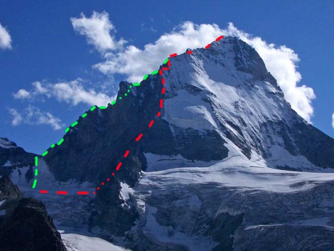 beide routen verfolgen bis zum vereinigungspunkt (~4040m) mehrheitlich die gratschneide. beim viereselsgrat werden die schwierigkeiten eher auf der plattigen nordseite angegangen, während man am martinsgrat zwei steile türme auf der südseite umgeht. nach dem vereinigungspunkt drängt einem ein steiler turm auf die nordseite ab. die im silbernagel-führer angegebene direkte variante über den turm haben wir nicht gefunden (ausser man ist bereit, eine unabsicherbare, überhängende wandstelle im sechsten grad in unzuverlässigem, brüchigem fels zu klettern). dafür kann man sich nach dem ersten aufschwung entlang eines schönen risses von einem rechts der kante angebrachten schlaghaken in die nordflanke ablassen. während sich die umgehung des turmes relativ einfach gestaltet, ist zumindest bei frisch verschneiten felsen das zurückklettern zum grat eine recht delikate angelegenheit. anschliessend bleibt man wieder alles auf dem grat, ein kleiner turm wird nochmals auf der nordseite angegangen. zum schluss kommt der berüchtigte, stellenweise unvorstellbar scharfe firngrat, der nochmals volle vorsicht erheischt. (7h)