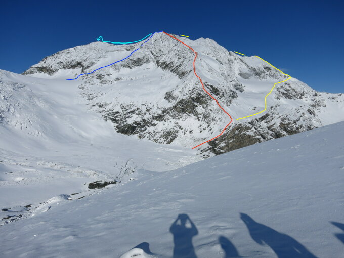 Variante Abstieg: vom Hauptgipfel auf den ersten Vorgipfel Richtung Diablons de Dames (ca. 100m). Dort in die Ost-Flanke absteigen. In der Flanke (i.S.d.A.) eher linkshaltend auf dem Rücken bleiben und später in flachem Gelände nach rechts unter den Fuss der Diablons de Dames queren.