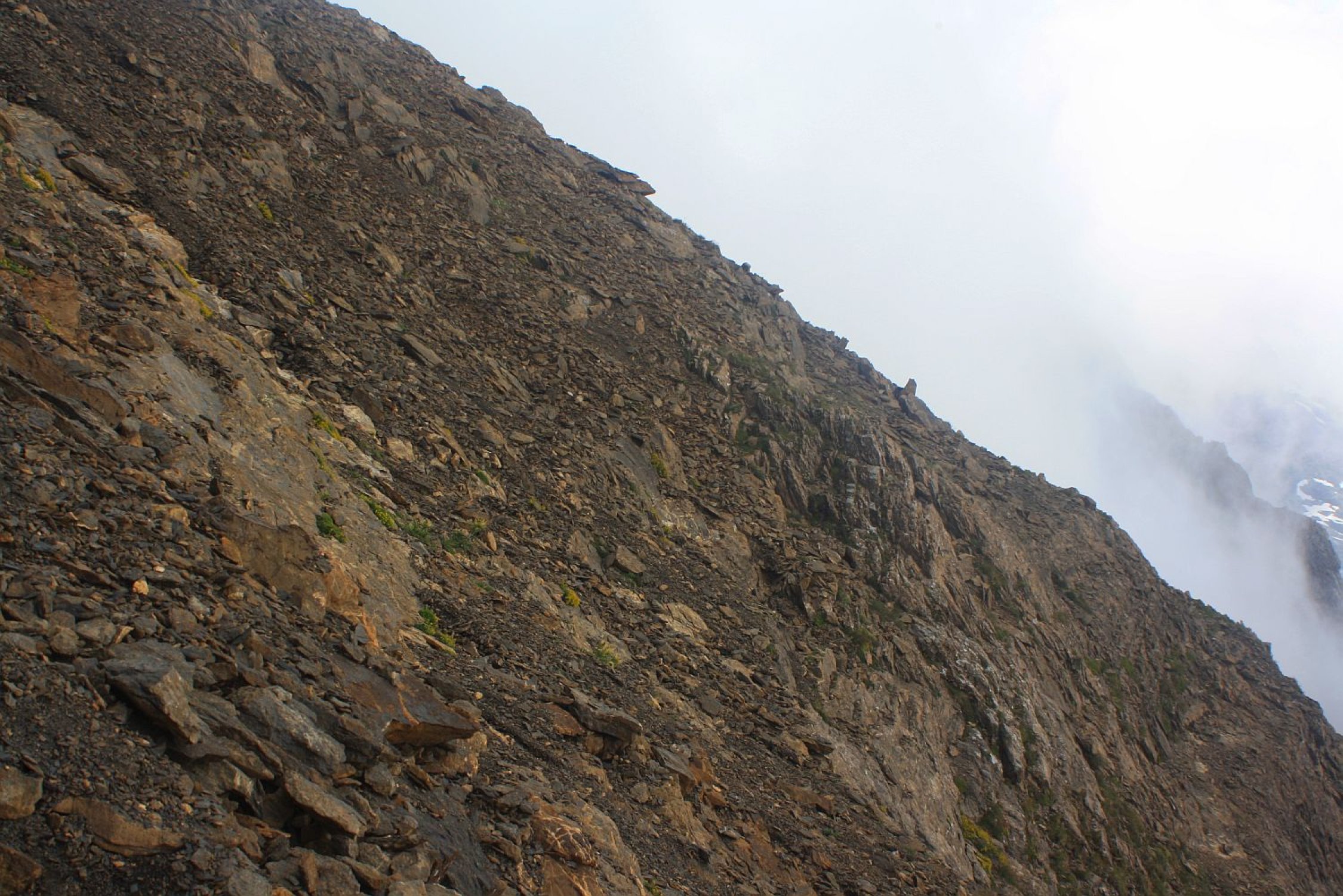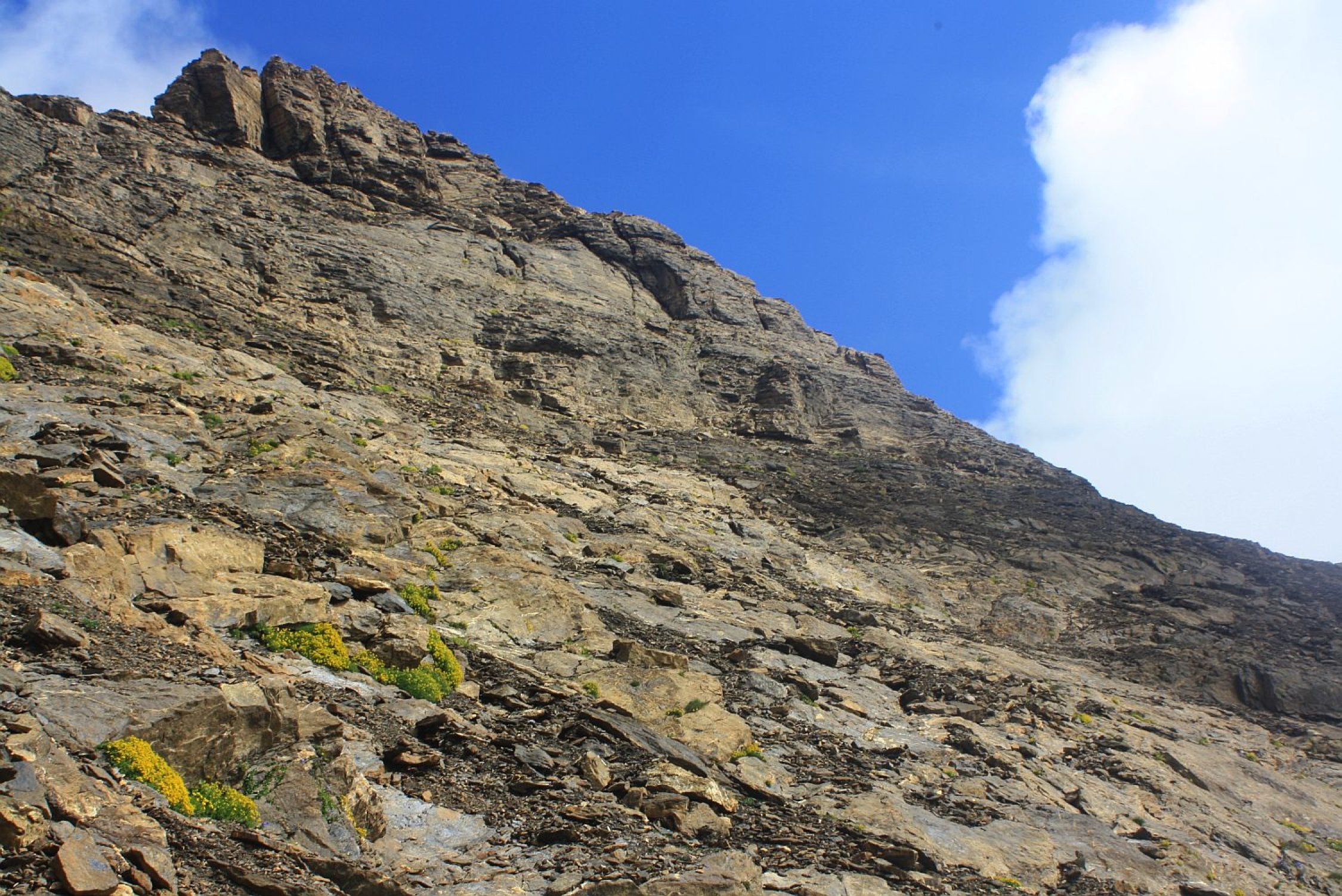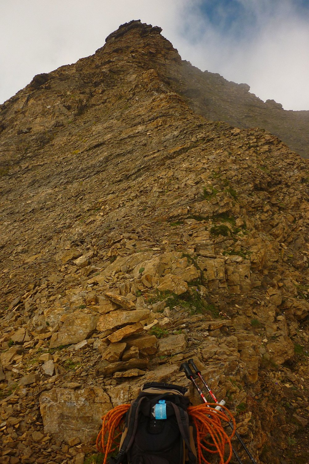 Helm und Wanderstöcke. Ein Sein ist kaum brauchbar im plattigen und sehr schuttigem Gelände.