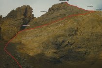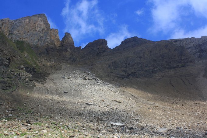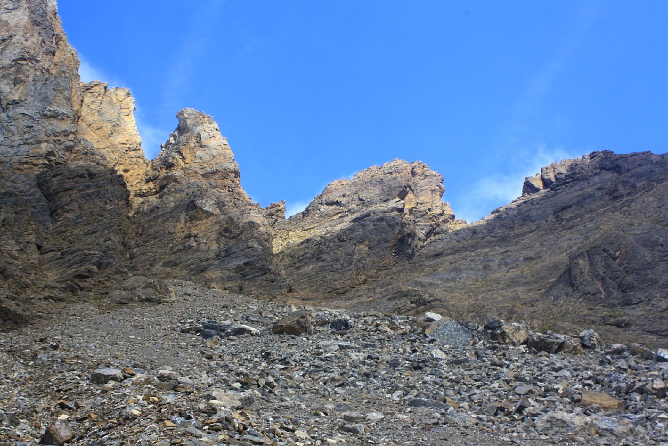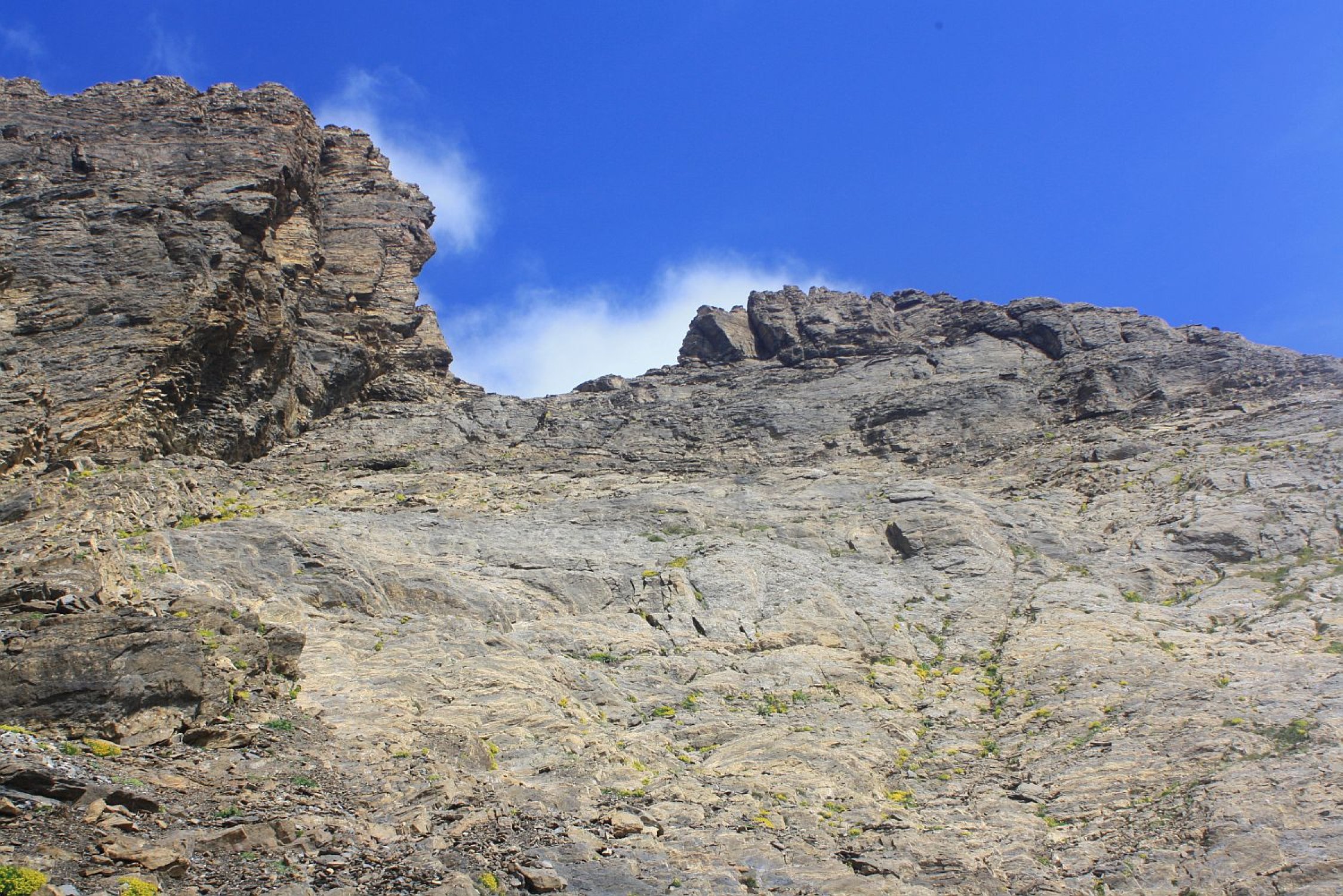 Helm und Wanderstöcke. Ein Sein ist kaum brauchbar im plattigen und sehr schuttigem Gelände.