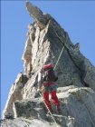 Nun einige Schritte runter in einen Sattel und hoch zu einem markanten Aufschwung. Zwei Bohrhacken markieren den Einstieg. Noch 2m höher bilden 2 weitere Bh den Stand bei entsprechender Schneehöhe. Die 23m hoch klettern zum nächsten Stand mit Zackenschlinge (eingerichtet zum Abseilen beim Abstieg). Weiter in der rechten Flanke unterhalb des Grates (Bh zur Zwischensicherung) und wieder hoch zum Grat bis zum Stand mit Kettchen (37m). Mit einem 50m Seil etwas weiter klettern und Stand mit eigener Schlinge. Weiter am kurzen Seil (oder 2x~50m gesichert) bis wieder geklettert werden muss. Die Gipfelplatte mit dem Gipfelbuch stellt die höchste Kletter Anforderung (4a?).