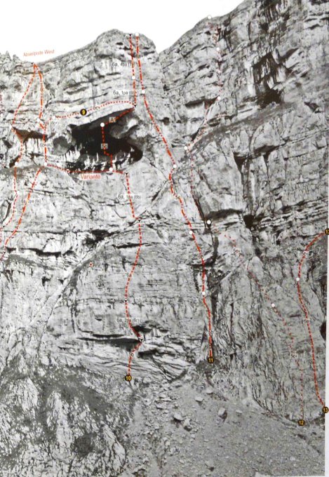 SL2 (SL3 von Highlight) 6c(+): Nach kurzer Querung auf einem bequemen Band geht es gleich tüchtig zur Sache. Die Einstiegssequenz ist abdrängend und gutgriffig, wenn auch richtig tough, da man irgendwie den Piaz auflösen muss... Danach geht es gefühlte 100m kontinuierlich nach re oben Richtung Dach, nie wirklich schwer aber auch nicht immer ganz leicht, an den bekannten horizontalen Löchern und Leisten. Eine wirklich schöne Lànge.