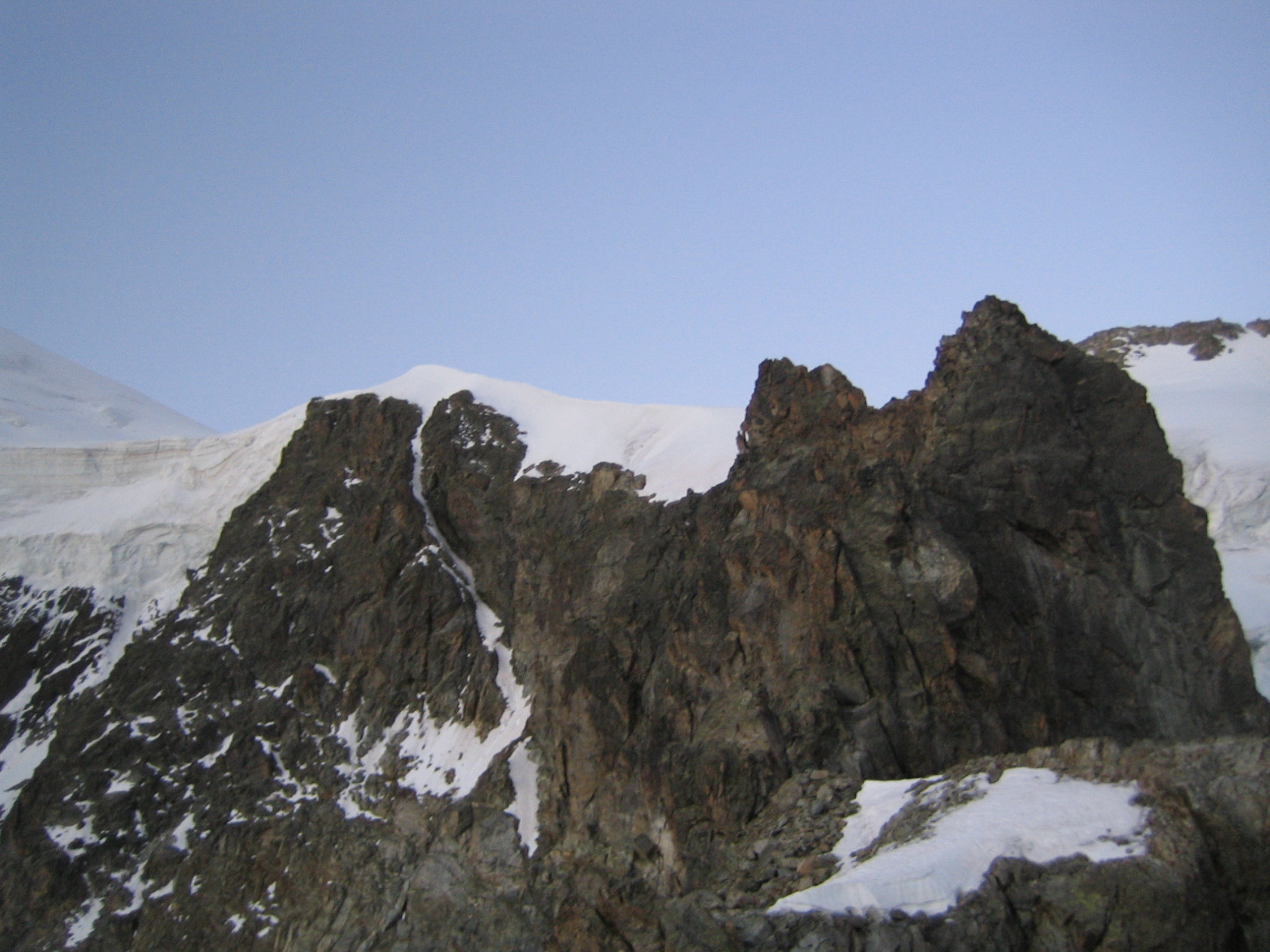 Nach zwei leichten Gendarmen gelangt man an den Fuss des grossen Felsaufschwunges dort senkrecht hoch bis auf den Grat ca. 100m es hat immmer wieder BH. Auf dem Grat kommt noch einmal ein kleiner Aufschwung wo man erklettern muss, ist auch mit BH ausgerüsstet.
