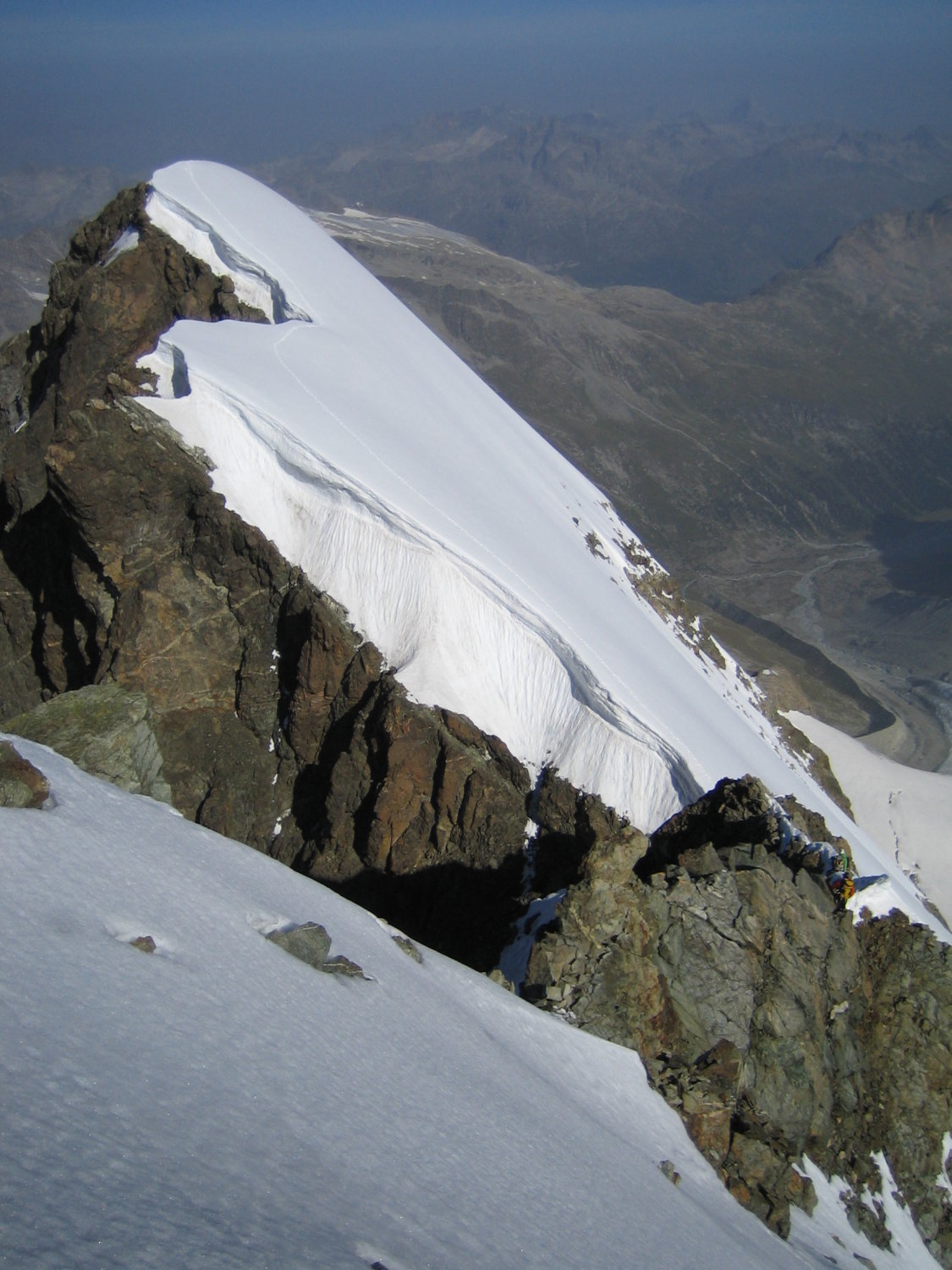 Anschliessend kommt man wieder auf den Firn wo man dann im Zick Zack aufsteig bis zur Schneekupe 3918m danach wieder leicht runter dem Gratfolgend auf den Hauptgipfel 3937.