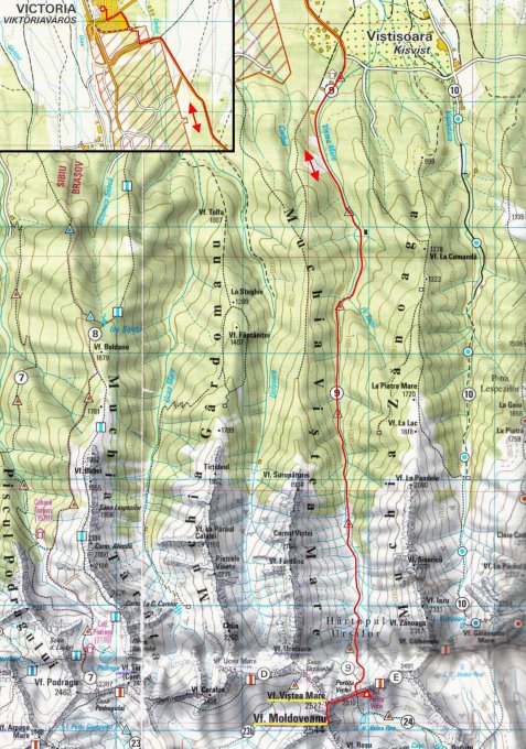 Der eigentliche Aufstieg beginnt bei Viştişoara, 4km südlich von Victoria (1h zu Fuss über Strasse). Bei einer gut markierten Abzweigung von der Strasse in Viştişoara beginnt der mit roten Dreiecken markierten Bergweg durch das wilde und enge Tal entlang des Baches Viştea Mare hinauf in den Talkessel Hârtopul Urşilor oberhalb der Waldgrenze. Von dort geht es steil hinauf in die Lücke Portiţa Viştei (2310m) wo sich in der Nähe auch die Biwakhütte Refugiul Portiţa Viştei befindet. Von der Lücke gelangt man über einen Grat mit wenigen einfachen Kletterstellen (I) auf den Vorgipfel Vârful Viştea Mare (2527m) und weiter über einen einfachen Verbindungsgrat zum Vârful Moldoveanu.