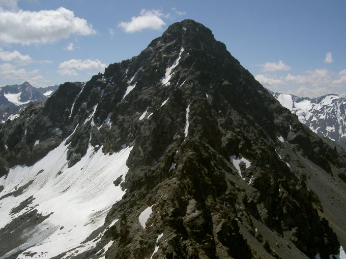 Hier beginnt nun die Suche nach der idealen Route. Der erste plattige Gendarm kann östlich in einem Riss relativ leicht erklettert werden. Nun steigt man auf der andern Seite auf der W-Seite in eine Scharte hinab. Die nächsten Gendarmen sind wesentlich einfacher und die Route eindeutiger: Meist kann auf der E-Seite umgangen werden (wenn auch die W-Seite die bessere Felsstruktur aufweist). Beim letzten Steilaufschwung kann man im Zickzack kletternd gegen eine Blockkante Höhe gewinnen. Schwierigkeiten umgeht man wieder östlich. Die letzten 50 Höhenmeter sind reiner Genuss in festem Amphibolit, bis man - meist völlig unerwartet - auf dem menschenüberfüllten Gipfel ankommt. Keine Tour für Plaisirkletterer, jedoch ein Muss für Abenteurer.