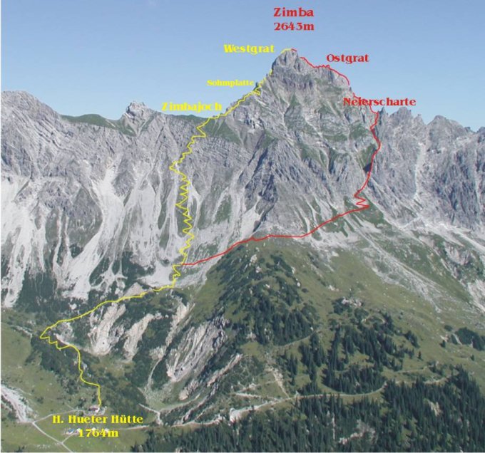 Abstieg über den Westgrat (II) bis zum Zimbajoch, von wo ein gut befestigter Weg nach Norden hinab zur Sarotlahütte führt.