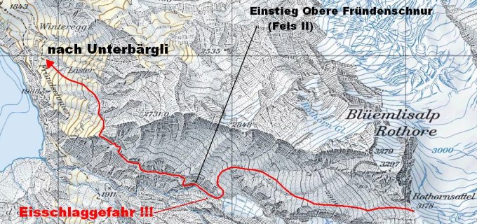 Bei Hartschnee Steigeisen; bei Nässe oder Vereisung ist die Obere Fründenschnur schnell sehr heikel.