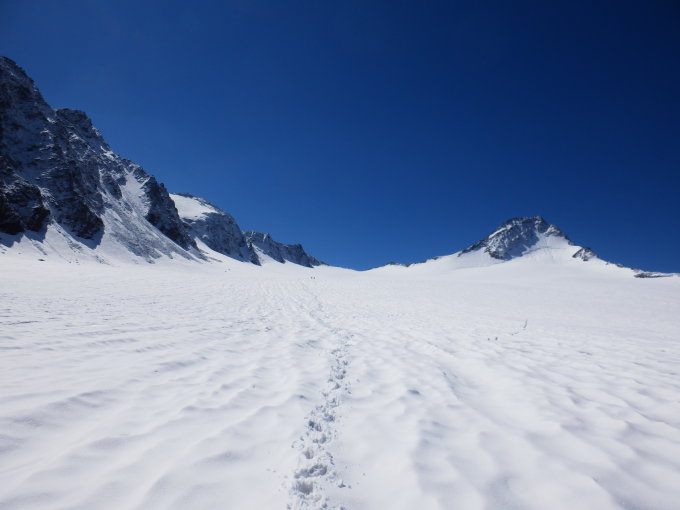 Hier bei einem deutlichen Steinmann auf nicht mehr markierten Steigspuren hinüber zum Hochjochferner. Man steigt nun den flachen Gletscher auf der Seite des Hauslabkogels hinauf auf die Fineilspitze zu. Man quert unter dem Hauslabjoch hindurch un erreicht eine markante Einsattelung östlich der Fineilspitze.