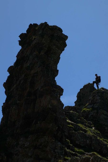 Lohnende Variante zur Normalroute (von Südosten): Vom Leist Richtung Süden in den Sattel zwischen Leist und Sächsmoor (P. 2132) und über den Südgrat des Sächsmoor, die Türme links umgehen. Bald steht man über dem Schuttcouloir, in dem die Normalroute hinaufführt und sieht auf das Felsband hinüber, das die Schlüsselstelle der Normalroute bildet. In dieses Couloir einfach hinabklettern (II) und auf der Normalroute weiter zum Gipfel.