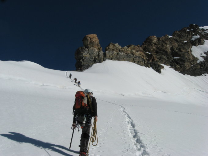 Der Aufstieg über den Südwestgrat ist eine sehr lohnende Alternative zum Normalaufstieg. Allerdings sind die Schwierigkeiten etwas höher als auf der Normalroute (Südarm des Ostgrates). Vom Ausgang des Sphinxstollen gegen den linken Rand des auffallenden Felsturmes am unteren Ende des SW-Grates halten. Der Felsturm wird auf der rechten Seite im Schnee umgangen, bis eine kurze Rinne (II-III) den Zugang zum Grat möglich macht. Nach der Rinne einige Meter auf der linken Seite unterhalb des Grates weiter, bis die Gratschneide in einfacher Kletterei schliesslich erreicht werden kann. Nun immer dem Grat folgend (I-II) bis zu einem plattigen Aufschwung (Schlüsselstelle III; geschlagener Haken am unteren Ende). Der Aufschwung ist in zwei Seillängen (je ca. 15m) unterteilt und kann mit Klemmkeilen und kleineren Friends abgesichert werden (mit Bandschlingen allein nicht absicherbar). Am linken Rand der Platte hochsteigen. Für die Nachsteiger kann am oberen Ende jeweils ein Stand z.B. mit Bandschlingen eingerichtet werden. Nach der Schlüsselstelle geht es in immer einfacher werdendem Gelände in genussvoller Kletterei (I-II) und Gehgelände weiter bis zum letzten Aufschwung vor dem Gipfel-Firngrat (nach P. 3811m). Bei günstigen Firnverhältnissen kann dieser Aufschwung rechts im Firn umgangen werden. Im unteren Teil ist diese Firnflanke noch mässig steil (ca.40°). Immer steiler werdend führt ganz am Schluss ein "Couloir" wieder auf den SW-Grat. Ist die rechte Seite ausgeapert oder vereist, quert man besser nach links und steigt über die Felsen wieder zurück auf den SW-Grat. Über den Firngrat (Achtung: Wechten auf der Südseite) weiter zum Gipfel. In den Felsen kann die Route problemlos mit Felsmaterial (Bandschlingen, Friends und Keile) sehr sicher gestaltet werden.