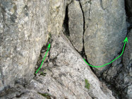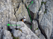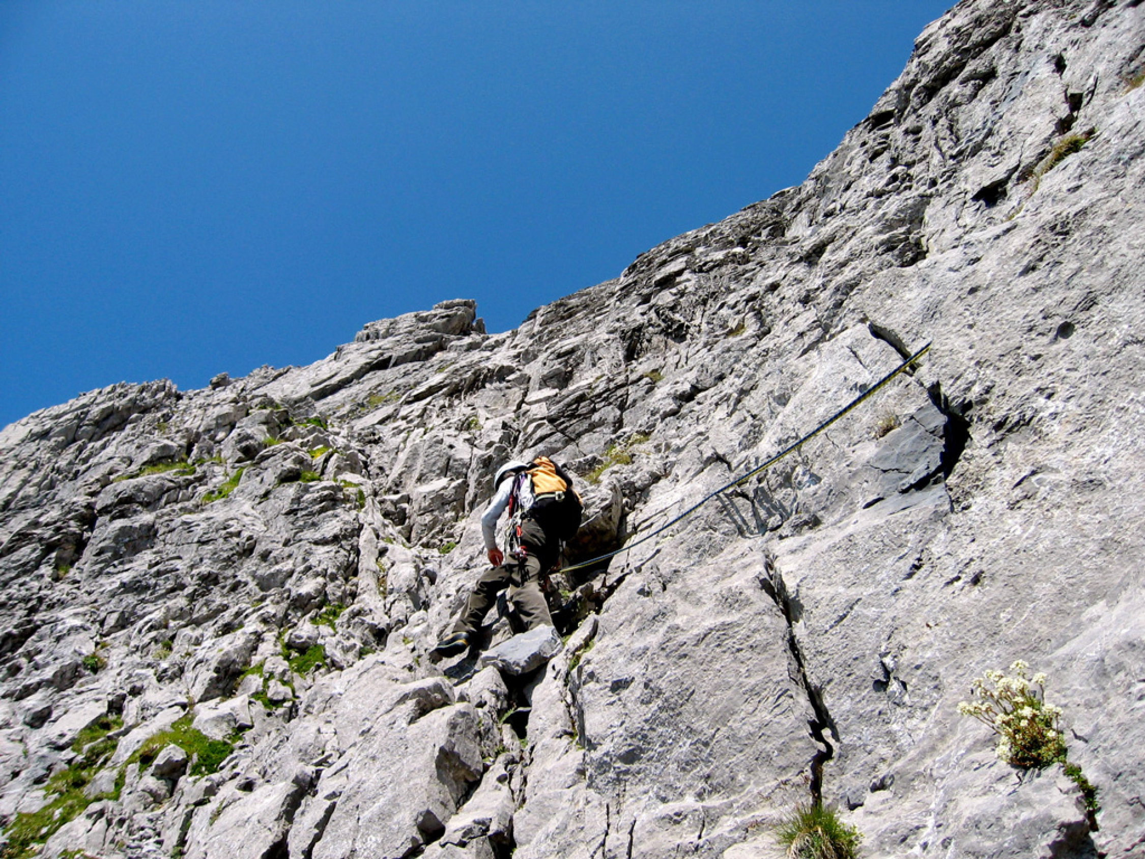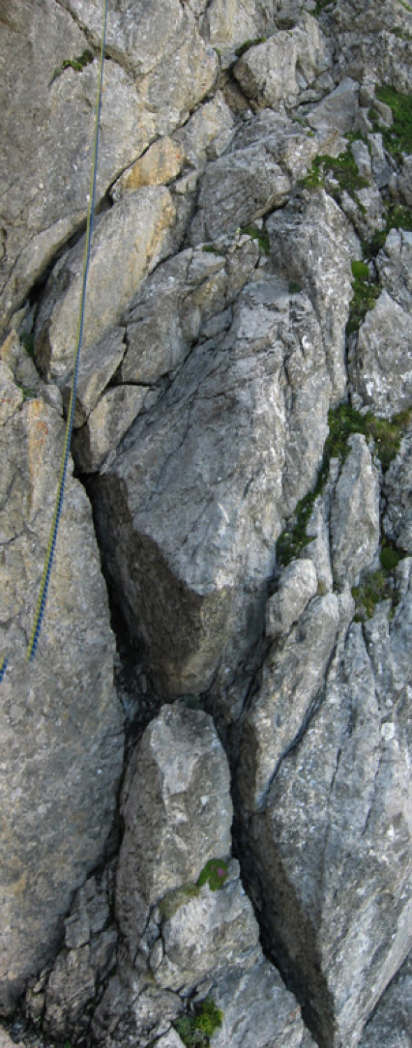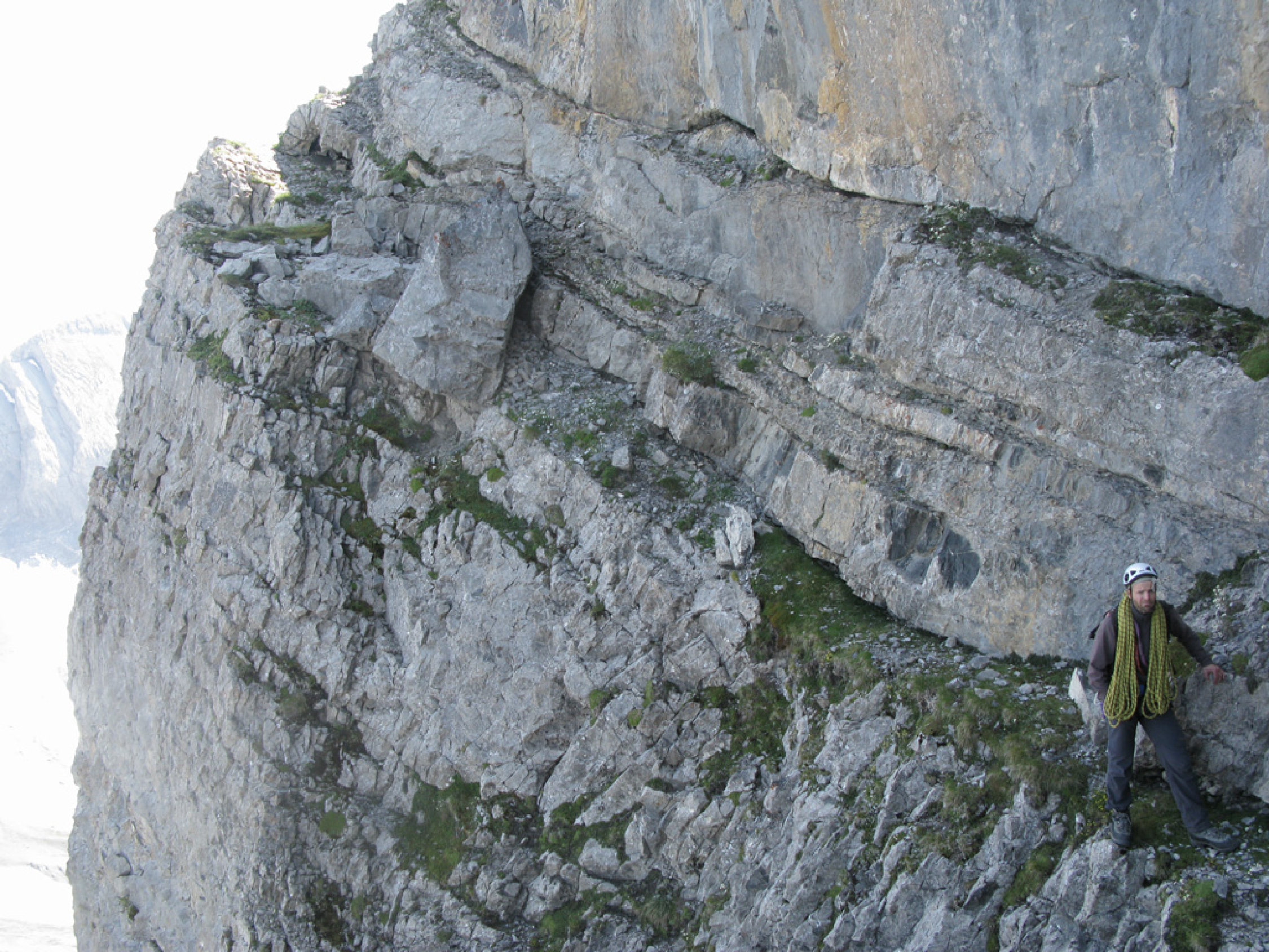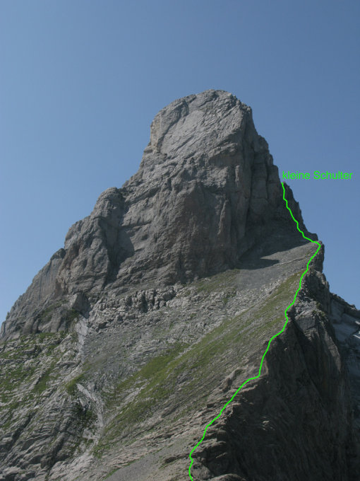 Die Beschreibung im aktuellen SAC-Führer "Alpinführer Glarner Alpen" ist für den mittleren Teil nicht ganz klar. Der eingezeichnete Routenverlauf Nr. 336 auf dem Bild S. 257 ist leicht verwirrend. Von der Ortsstockfurggele folgt man dem Südostgrat bis zu einer kleinen Schulter, welche links von einer glatten Felswand begrenzt wird (Bild 1). Von hier erreicht man über eine gutgriffige, etwas absteigende Traverse eine kleine Nische (Bild 2). Die Schlüsselstelle bildet ein kurzer fast senkrechter Riss mit schwierigem Ausstieg nach rechts auf eine glatte Platte (Bild 3 und Bild 4). Drei alte Normalhaken bieten etwas Sicherheit. Ueber Schrofen erreicht man eine Abseilstelle (ca. 25 m) auf einem Band, welches fast horizontal um den halben Berg herum führt. Es ist von unten nicht sichtbar, aber leicht begehbar (Bild 5). Diesem Band folgt man zuerst nach Südosten, dann nach Westen und schliesslich nach Nordosten, bis rechts eine leicht besteigbare Flanke sichtbar wird. Die Felsen sind weit weniger brüchig, als es von unten scheint. Die Kletterei ist einfach, aber die Sicherungsmöglichkeiten spärlich (Bild 6). Nun entweder dem stellenweise etwas wackligen Südostgrat folgend oder etwas links davon leicht auf den Gipfel.