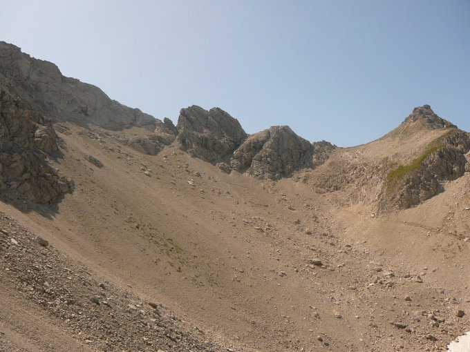 über gute Bänder den Vorbau hinauf, der auf halber Höhe über die "Schnur" westlich umgangen wird; auf gutem Steig in vielen Kehren den Markierungen folgend die geröllbedeckte Westflanke hinauf und über einige Blöcke unschwierig auf den Gipfel