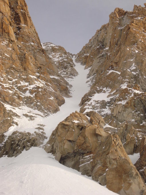 Über den Bergschrund hinüber und der Schneerinne bis zum Ende am Grat folgen. Auf der Hälfte der Rinne kann zwischen dem linken und rechten Arm des "Y" gewählt werden, wobei der linke etwas steinschlaggefährdet ist. Durchschnittsneigung etwa 45°.