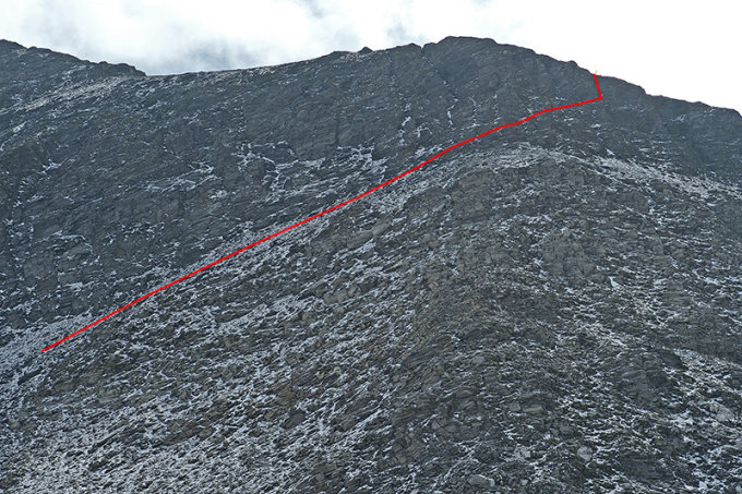 Mehrheitlich deutlich sichtbare Steigspuren führen nun entlang des Westgrates in der im oberen Teil zunehmend abschüssigen, brüchigen Südwestflanke über Schutt und leichte Schrofen zum Gipfelkreuz.