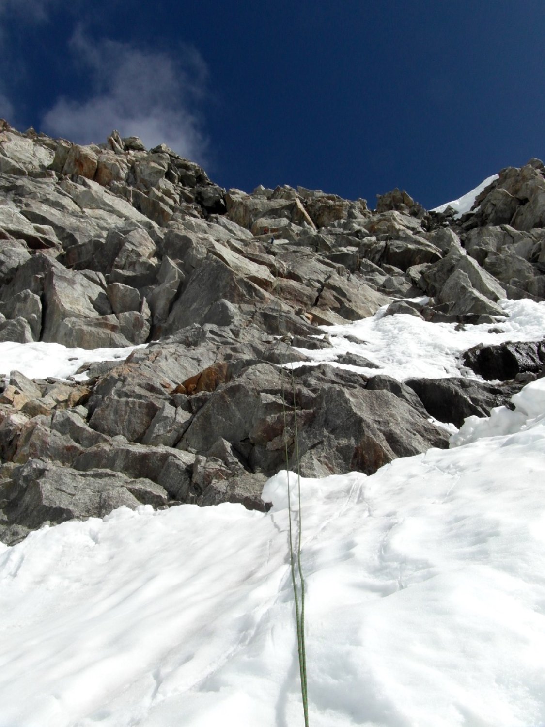Ebenso ist die im Frühling vorzuziehende Variante über den Gletscher bis etwa 3300 m später im Jahr durch riesige Querspalten verlegt. Ansonsten leichteste Möglichkeit.