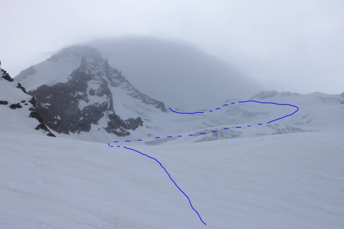 Unter diesem durch, bis man den grossen Rücken bei P. 3957 erreicht. Ein Aufstieg von dort zu P. 4075 ist bei wenig Schnee wahrscheinlich wegen dem Gletscherrückgang recht anspruchsvoll geworden.