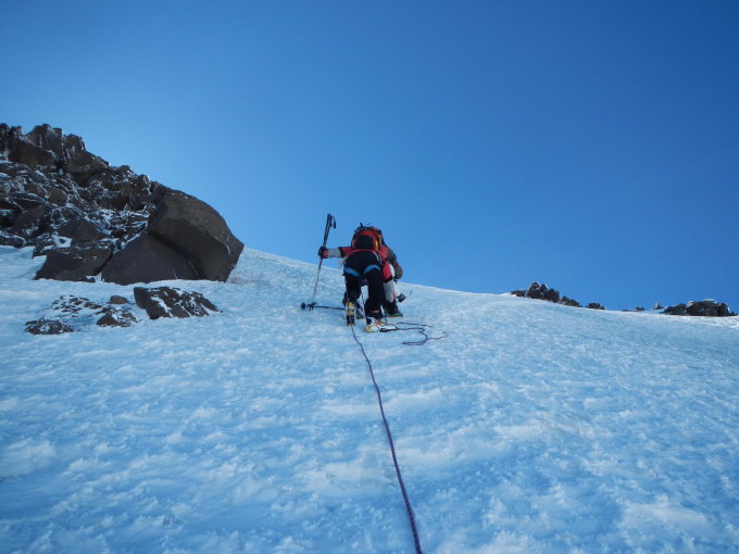 Nachdem überwinden der kleinen Wechte erreichen wir den Sattel auf 4.850 m und gehen über kurzes Gehgelände linkshaltend hinüber zur 45 Grad steilen und ca. 140 m hohen Gipfelflanke. Durch die Niederschläge der letzten Tage herrschen recht gute Verhältnisse, die Flanke kann recht einfach im Trittfirn überwunden werden, ohne dass man auf Blankeis gestoßen wäre. Die Eispickel kamen so nicht zum Einsatz. Der Aufschwung flacht sich leicht ab und es folgen die letzten 40 HM zum Gipfel. Problemlos erreichen wir um 11 Uhr 50 den Gipfel des Kasbek auf 5.033 m ohne auch nur ein wenig zu sehen.