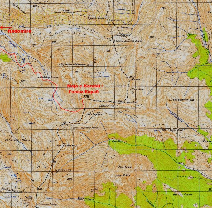 Hinter der kleinen Dorfbeiz am oberen Ende von Radomirë (1250m) beginnt der Saumpfad hinauf zu den Sommerweiden der Schäfer. Er verläuft immer etwa in Südöstlicher Richtung und man trifft oft Hirten die einem den Weg weisen können. Die im Anhang beigelegte Karte zeigt die ungefähre Route.