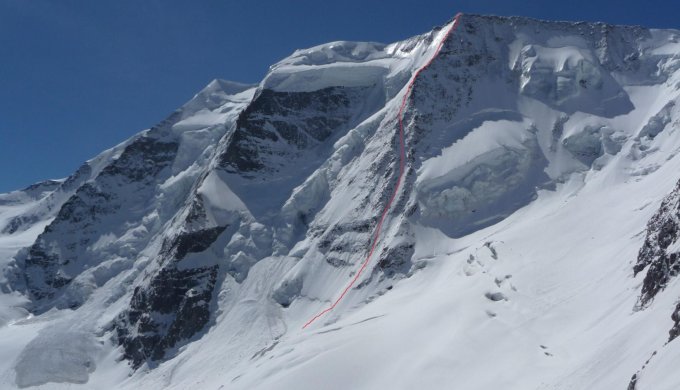 Durch das markante Firn/Eiscouloir hinauf (bis 50 Grad). Dann im felsdurchsetzten Gelände schräg links empor bis wieder nach rechts zur Gratkante geklettert werden kann (M2-3). Nun entweder auf der Gratkante entlang weiter gen Gipfel oder die felsigen Aufschwünge in der östlichen Eisflanke umklettern.