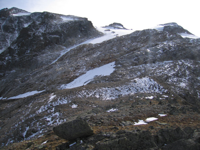 Auf dem Westgrat zurückgehen bis zu der Felsrippe neben dem ersten Firnfeld.