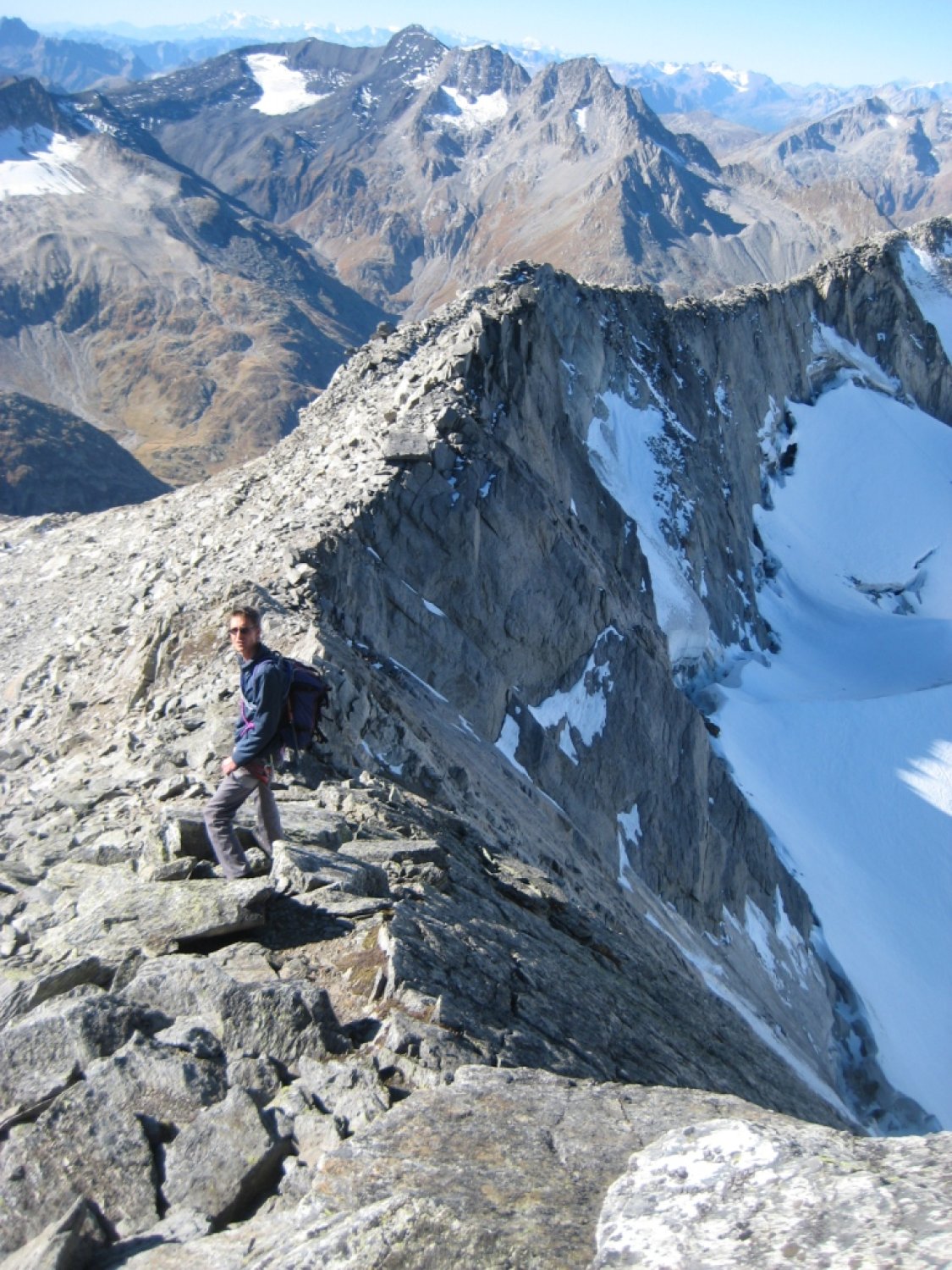 Route: Auf dem markierten Weg zum Gletscher und über diesen auf den Piz Medel (Von der Medelserhütte SAC). Nun folgt man zunächst 200m dem Grat weiter bis vor einen Aufschwung mit einem 2m hohen Block. Hier verlässt man den Grat nach rechts und erreicht auf Wegspuren den Vadrecc di Camadra. Die Höhe haltend überquert man diesen Zwerggletscher und ersteigt durch einfaches Gehgelände die Cima da Camadra, 3172m. Der Grat senkt sich nun Richtung Südosten 60 Hm steil aber einfach hinunter und dreht auf 3110m wieder nach Westen. Meist mehr gehend als kletternd erreicht man den Aufschwung zum Piz Uffiern. Er wird direkt über den Grat erklettert (II). Für den Abstieg wählt man den W-Grat. Nach ca. 100m kann der Gletscher rechterhand einfach betreten werden und über ihn schreitet man zur Fuorcla Cristallina, 3003m hinunter. Nun wieder alles über den Grat bis zum Piz Cristallina, 3128m.