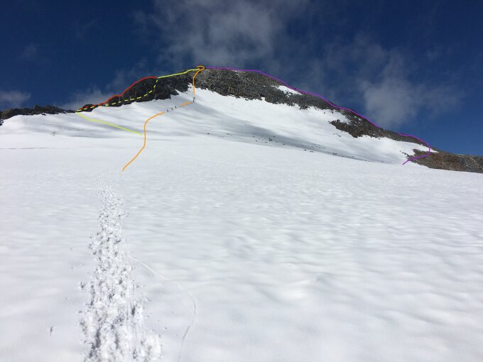 Die Passage zwischen den Ketten und dem Gletscher kann im Frühjahr oder bei schlechter Sicht die Hauptanforderung dieses Zustiegs darstellen und sollte nicht unterschätzt werden.