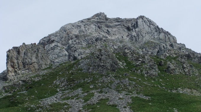Routenbeschreibung (Schwierigkeit: KS 2): Nach dem "Munggepfad" über ein schmales, schuttiges Felsband rechts hinauf zu gestuften Felsen. Durch steile Felsrinne zum Südgrat ("Gemstritt"). Auf diesem unschwierig zur südwärts ausgerichteten Gipfelwand. Über eine 30 m hohe kompakte Platte ("Steinbockplangge") klettert man auf genügend Eisenklammern. Danach linkshaltend zu gerölligem Felsrücken. Von dort in wenigen Serpentinen Trittspuren ("Adlerhorst") folgend meist sicherungsseilfrei zum Gipfelkreuz (40 min.).